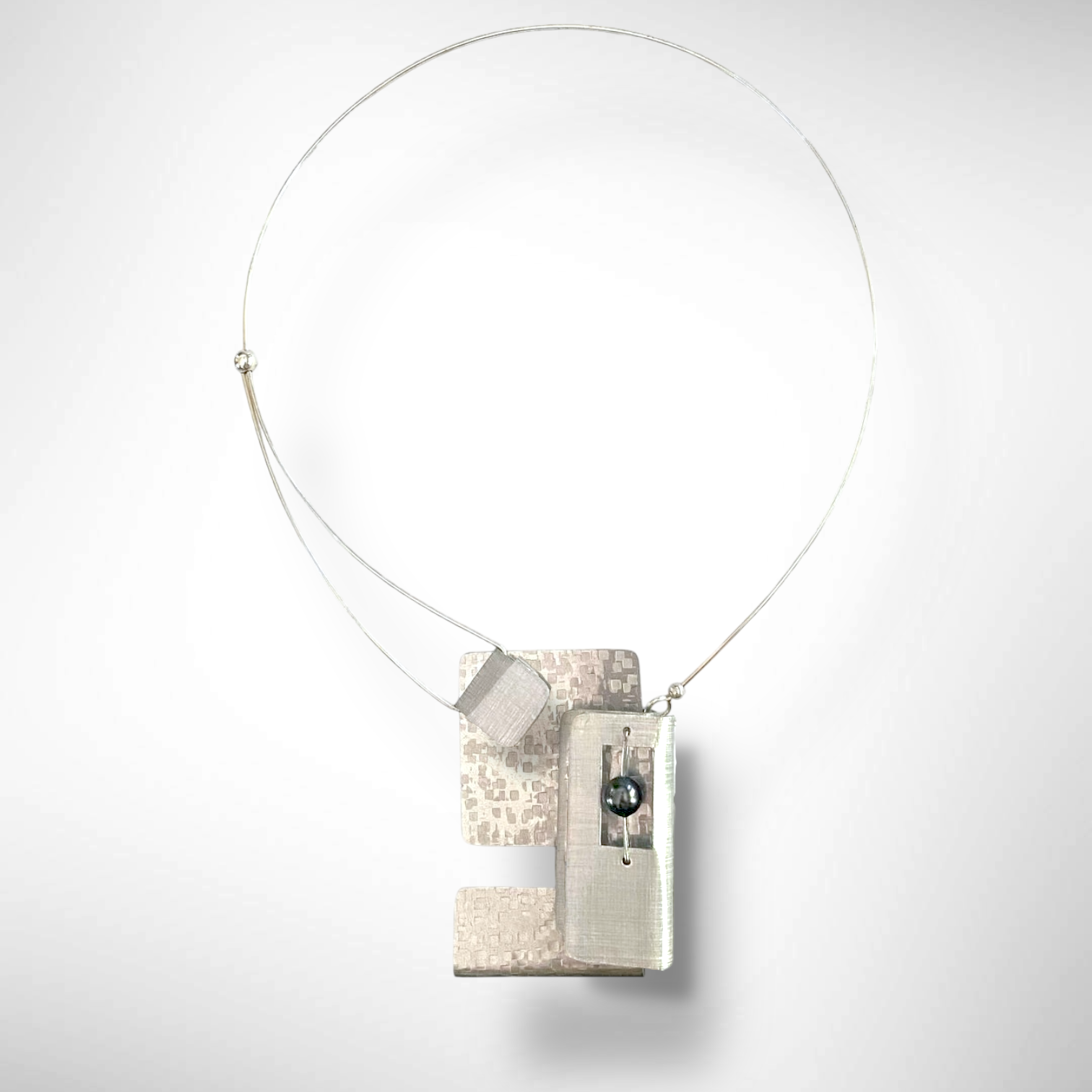 Cubic metal necklace with elegant squares and rectangles. Hand-cut and textured aluminum, brass, or copper squares folded into Books with suspended accent bead.