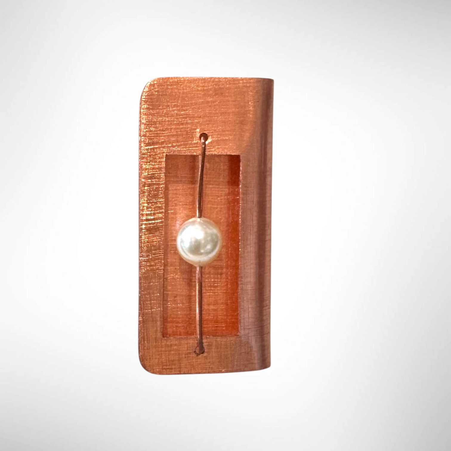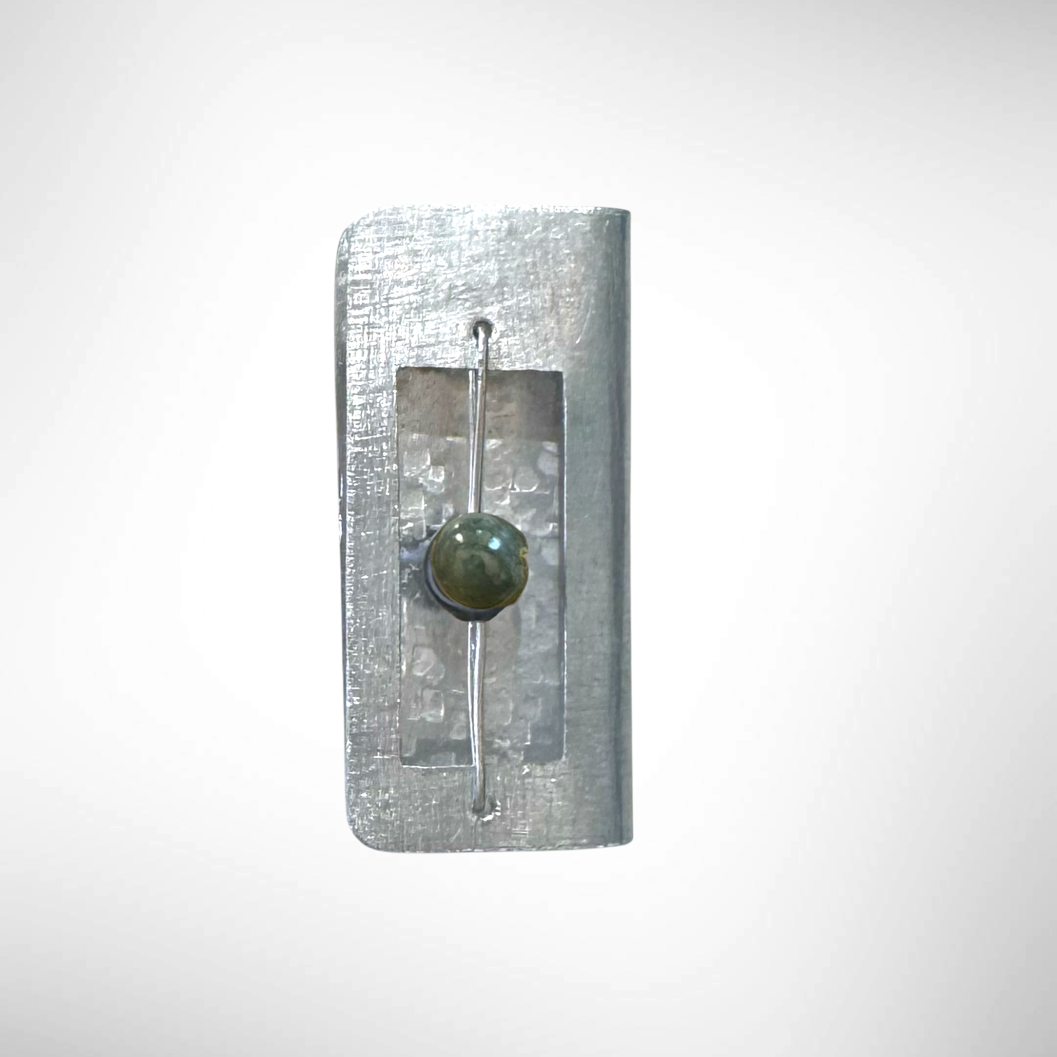 Hand-cut and textured aluminum, brass, or copper squares folded into a Book with suspended accent bead. Finish bead options of Simulated Crystal Pearl or Guatemalan Jade.