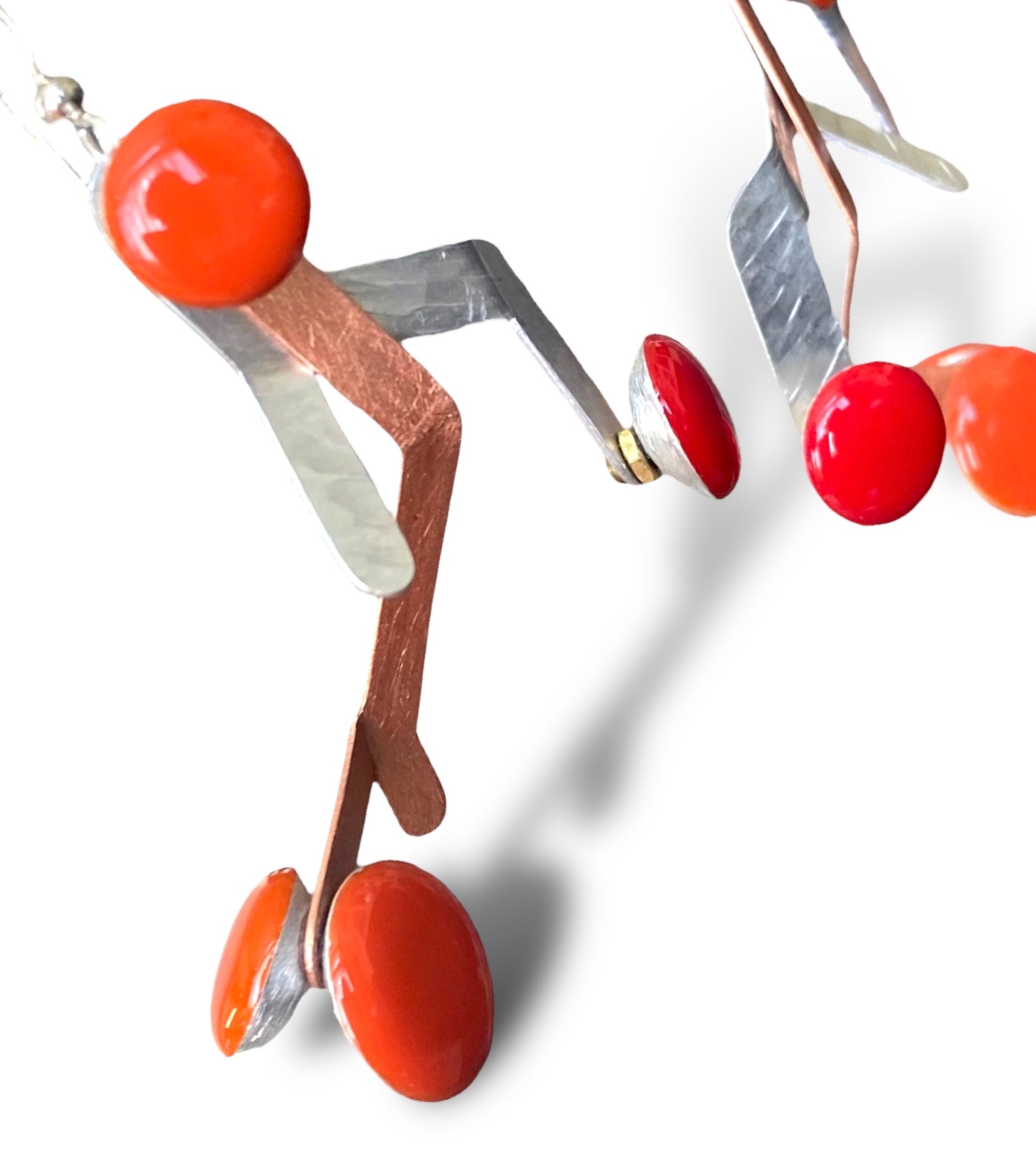 Fruit on the vine, ready for harvest and at the peak of freshness. A contemporary, almost mid-century look. These are earrings you'll want to wear with your hair up. Delicate hand cut & textured aluminum and copper with orange and red resin cups. Copper has been treated with polyurethane to retard oxidation. Sterling Silver ear wires.