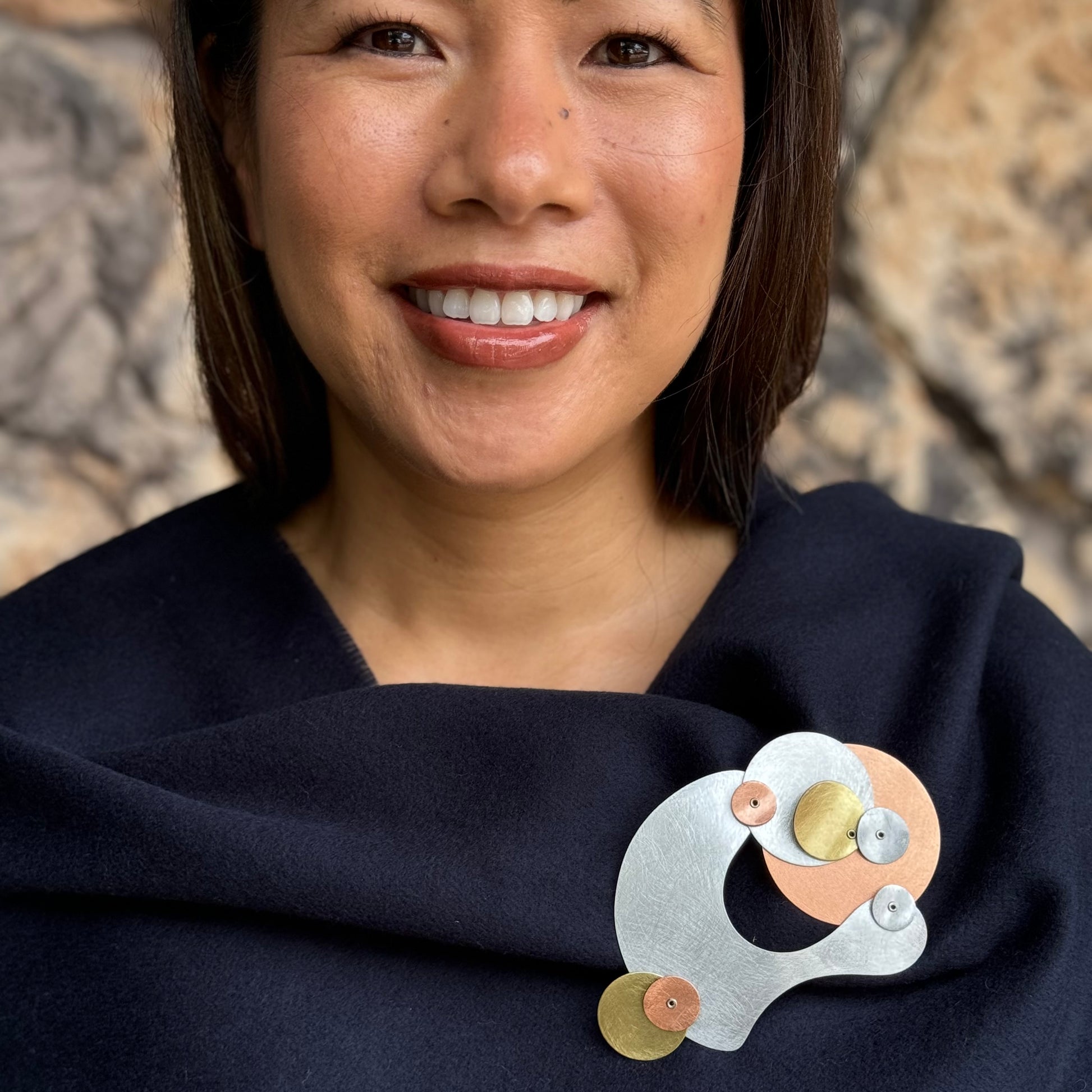 Suspended stretched bubble surrounded by smaller round spheres in a striking brooch. The light, airy design adds a dreamlike quality to any outer garment or scarf. 4 1/2" Long x 3" Wide Aluminum, Brass and Copper with polyester cord and magnetic clasp Brass and Copper are treated with polyurethane.