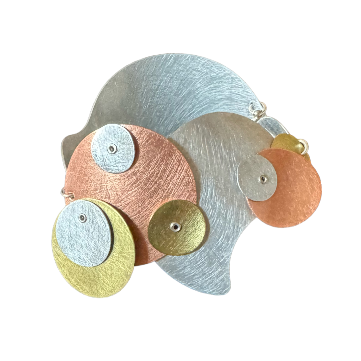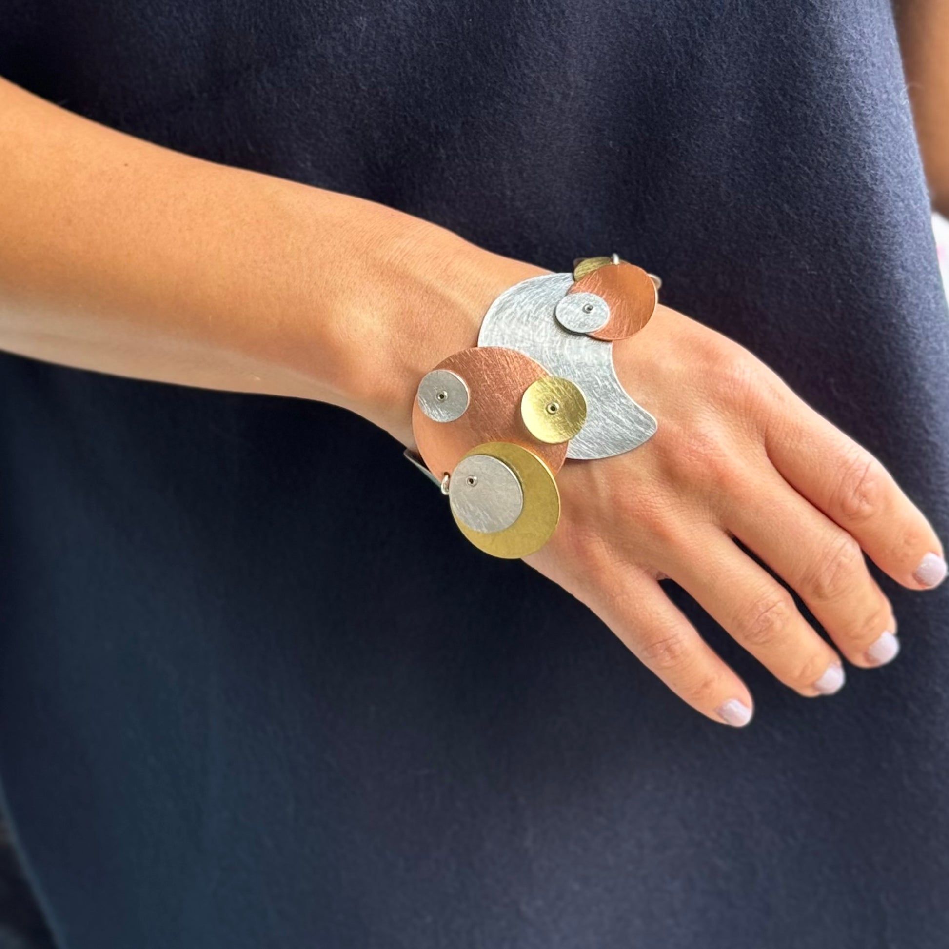 This dangle bracelet offers two different looks. One side includes a large grouping of stretched and spherical pieces while the other features a lone stretched bubble ready to burst. The bubbles seem to hover just above the wrist, creating a lightweight and ethereal feel. This piece embodies the weightlessness of floating bubbles, making it both comfortable and elegant. Magnetic clasp 7 1/2" Long x 2" Wide Aluminum, Copper and Brass Copper and Brass sealed with polyurethane