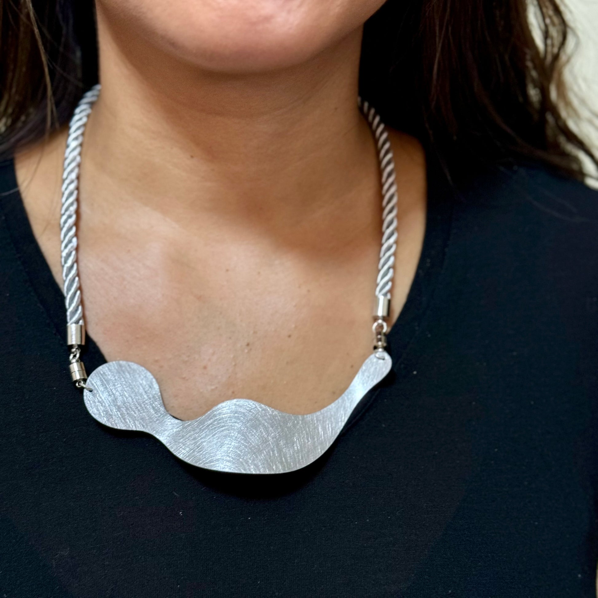 Open, airy mix and match design. This one necklace provides six different looks depending on which pieces you attach to which and in what direction. Customers will have fun playing with the possibilities. Entire Piece: 28" Long Aluminum, Brass and Copper with shiny grey polyester cord Magnetic Clasps Brass and Copper are sealed with polyurethane.