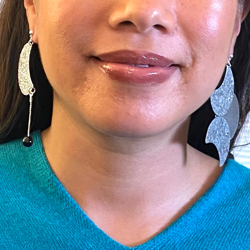 Be BOLD in this unique & fashionable look.Playful and flirty, mismatched, yet balanced pair of post earrings with intricate hand-hammered ƒ??flowerƒ?� designs and 1 dangling Onyx buttonHand-cut and textured aluminum. Posts are Sterling silver.