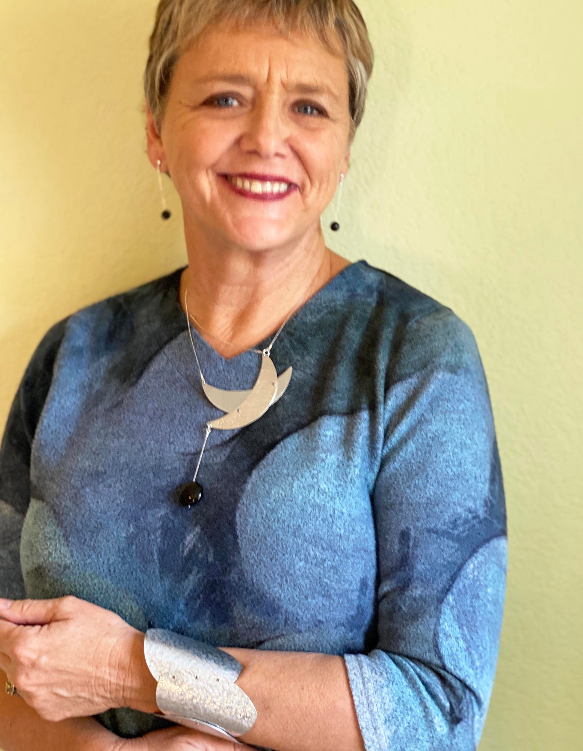 A delicate, lightweight aluminum necklace featuring two crescent moons. Hand textured, asymmetrical sterling chain and lobster claw clasp.