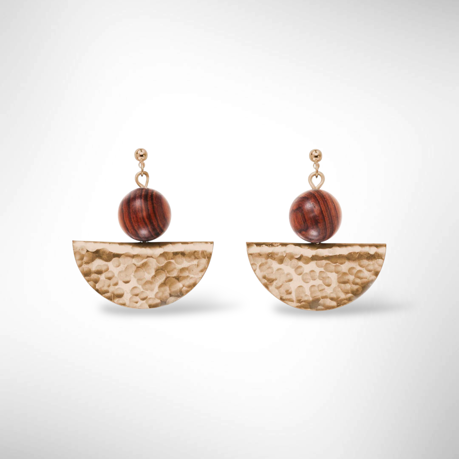 Connect to nature in these organic earrings made with hand-turned wooden beads from the rainforest of Guatemala "Silvia" from the Chick Boss Organic Collection Hand-cut and textured aluminum, brass and copper Ear posts are Sterling Silver, Rose Gold fill or 14 karat Yellow Gold fill.