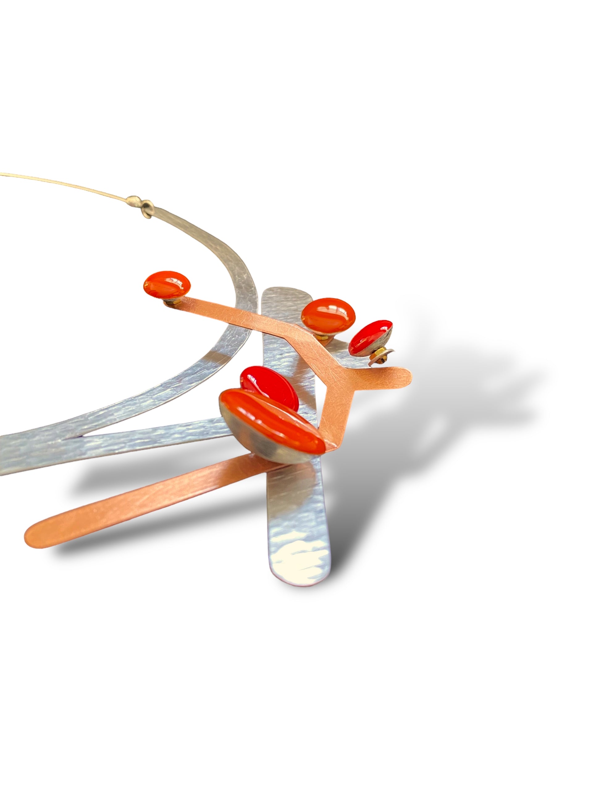 Representing old vines with history and strength. This necklace represents the process of renewal during the lifecycle of the vine. Delicate hand cut & textured aluminum and copper with orange and red resin cups. Copper has been treated with polyurethane to retard oxidation. A contemporary, almost mid-century look. This is a medium sized statement necklace with an easy front closure.