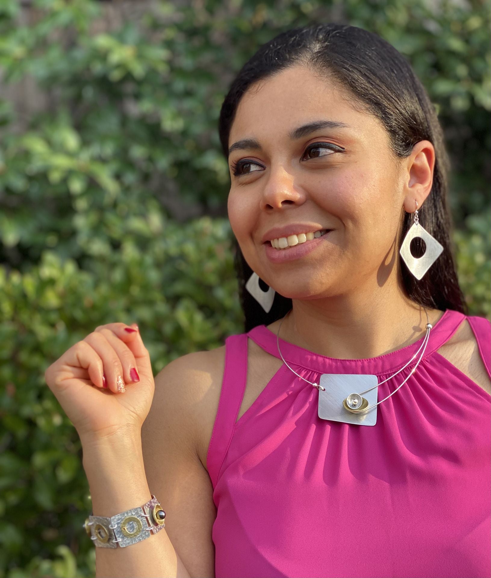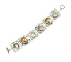 Classic style meets contemporary design! Linking squares & accent beads make this an artistic masterpiece sure to attract admirers. Features hand-cut, textured aluminum and brass, or hand-cut, textured brass and copper (brass and copper are sealed with polyurethane to retard oxidation). 8 inches long with large toggle clasp. Accent Bead Options: Metal Finish Bead, Simulated Crystal Pearl, Guatemalan Jade.