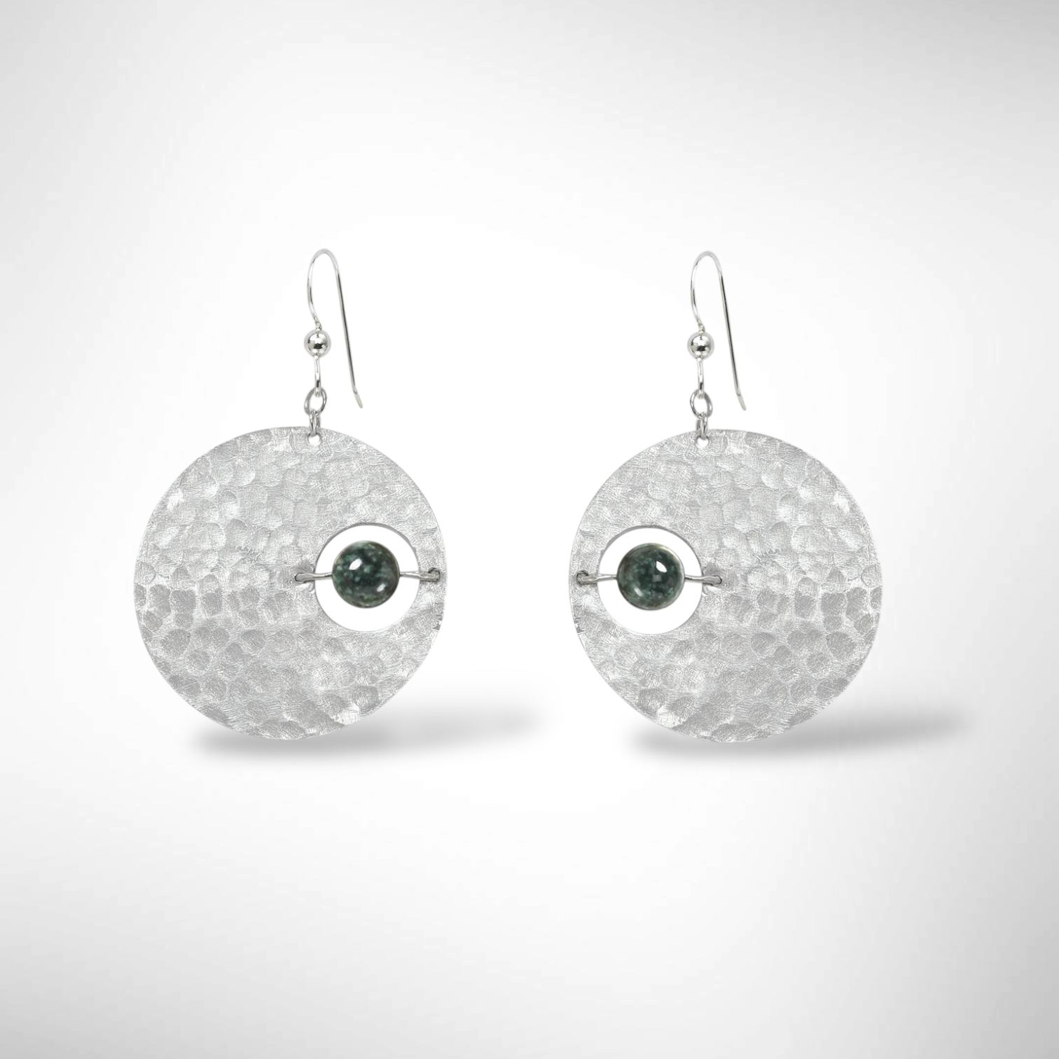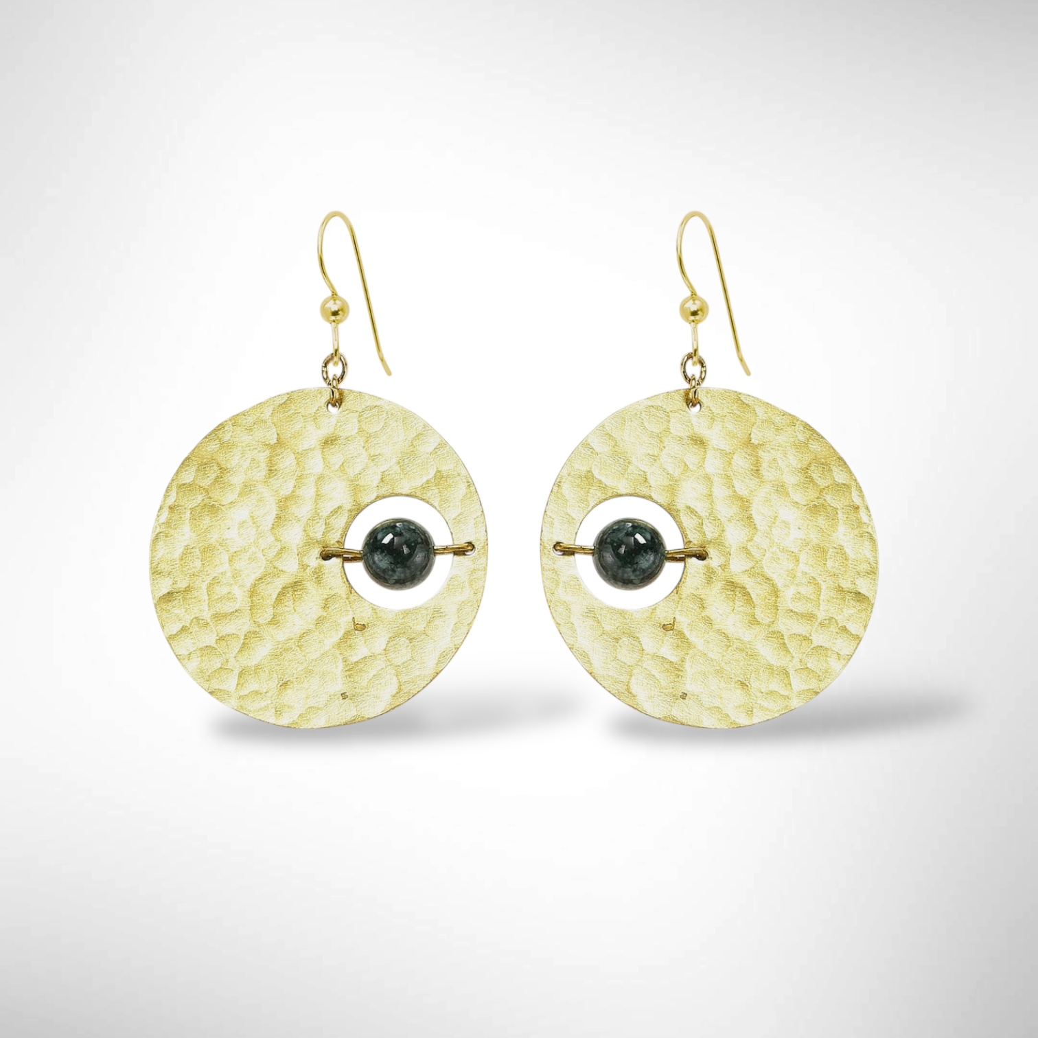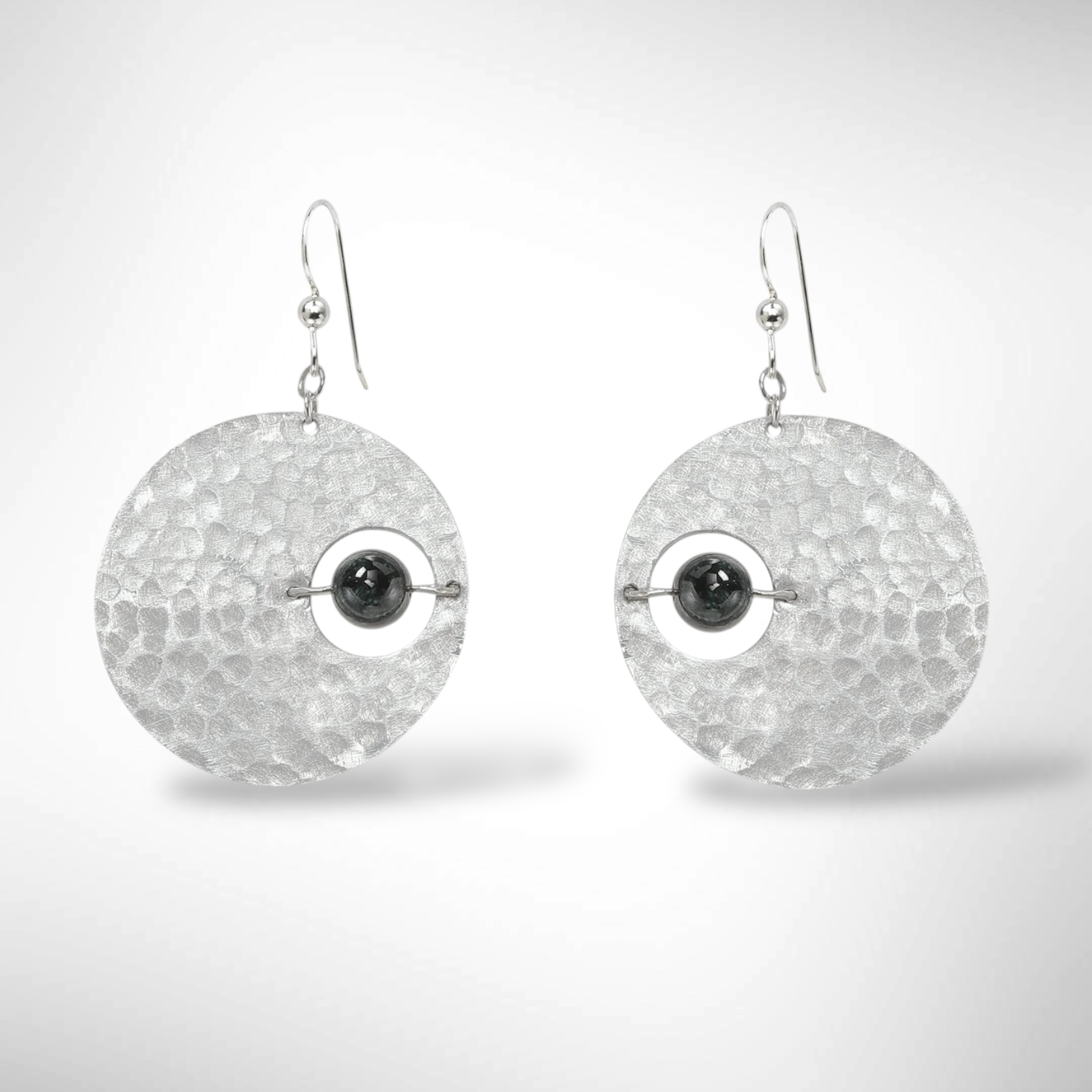 `1 1/2" wide Aluminum, Brass or Copper circles with asymmetrical Simulated Pearls suspended on an "axis." Brass and Copper are sealed with polyurethane to retard oxidation. Ear wires are Sterling Silver or gold-fill.
