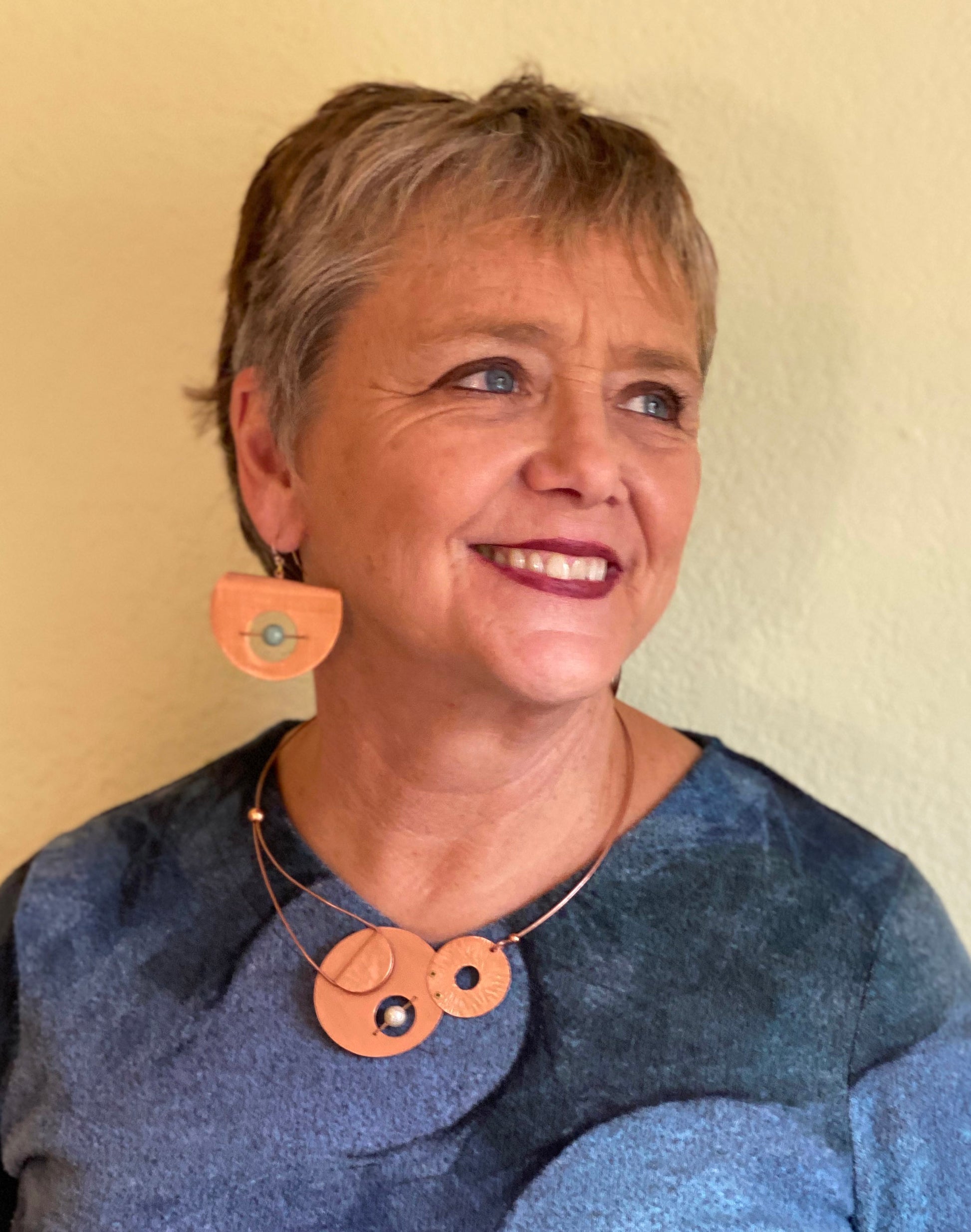 Sculptural dangle earrings that “fold” over with suspended bead on a wire axis. Earwires are Sterling Silver or Gold-Fill Hand-cut, textured aluminum, copper and brass. Copper and brass are sealed with polyurethane to retard oxidation.