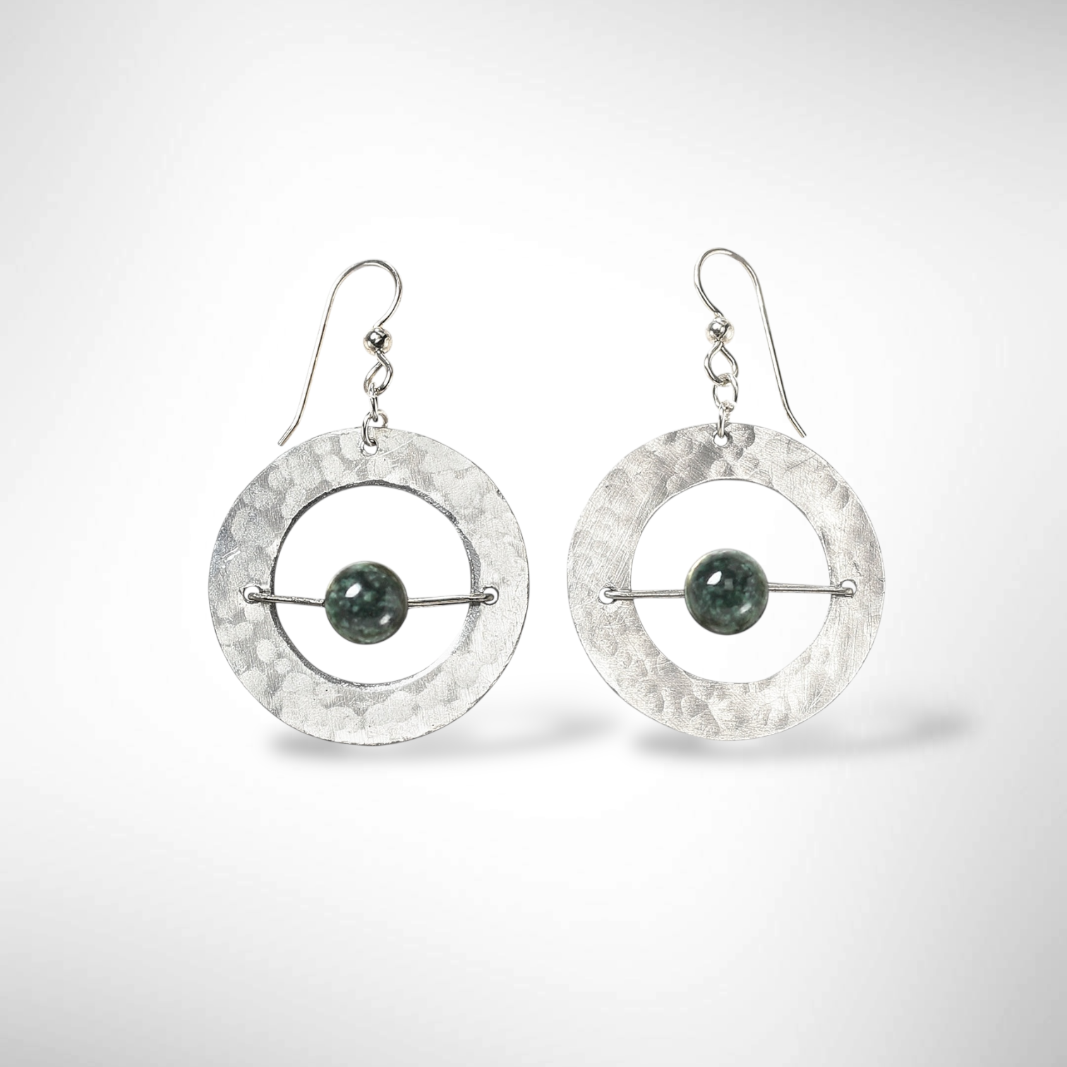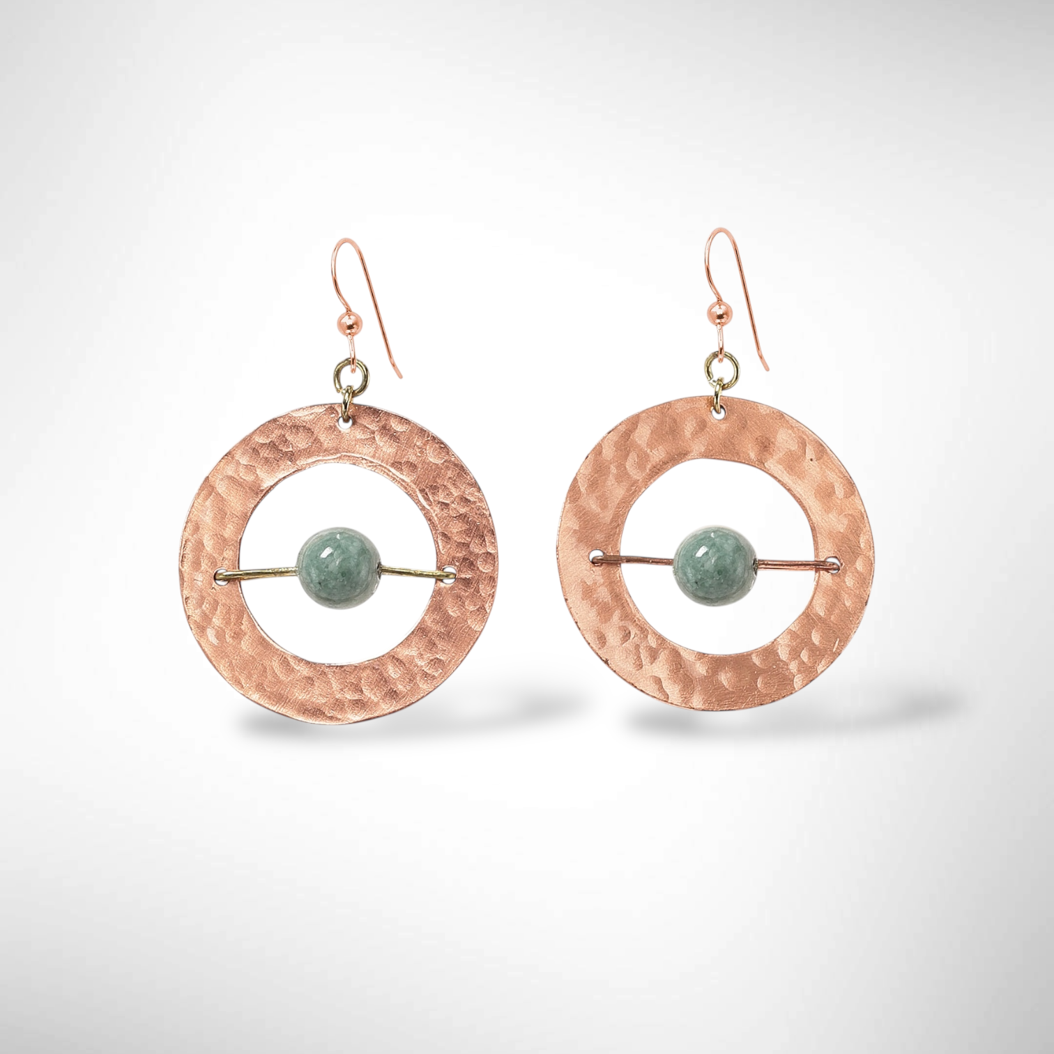 Fun sculptural earrings that feature a suspended bead on a wire axis. "Axis Small" from the Chick Boss Sculptural Collection Accent bead options: simulated pearl or Guatemalan Jade Hand-cut, textured aluminum, copper and brass. Copper and brass are sealed with polyurethane to retard oxidation.