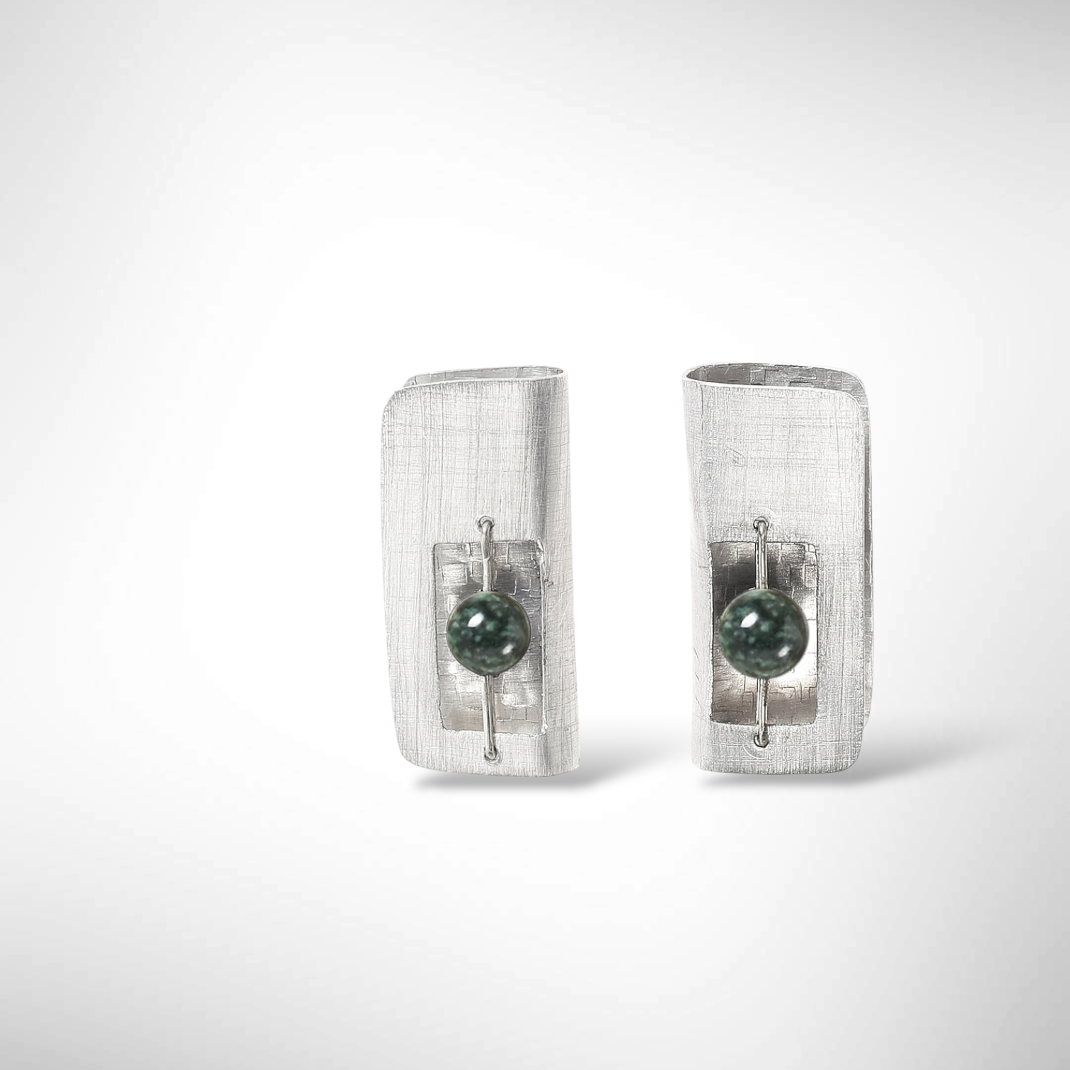 Hand-cut and textured aluminum, brass, or copper squares folded into Books with suspended accent bead. Finish bead options of Simulated Crystal Pearl or Guatemalan Jade. Sterling silver, yellow gold, or rose gold fill posts with large backs.
