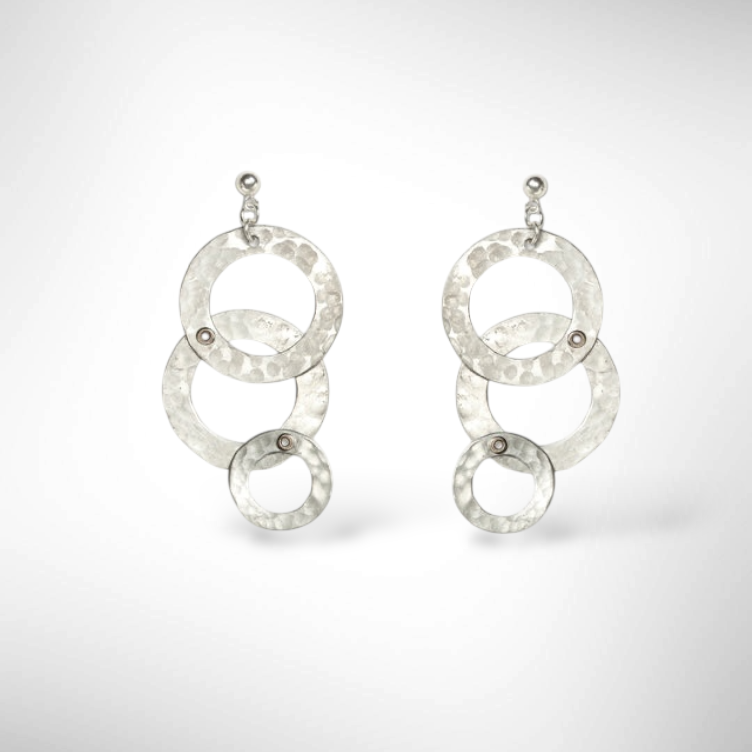 Three asymmetrical circles make these post earrings simply delightful Hand-cut & textured aluminum or copper Sterling or Gold-Fill posts with "monster" backs Copper is treated with polyurethane to retard oxidation