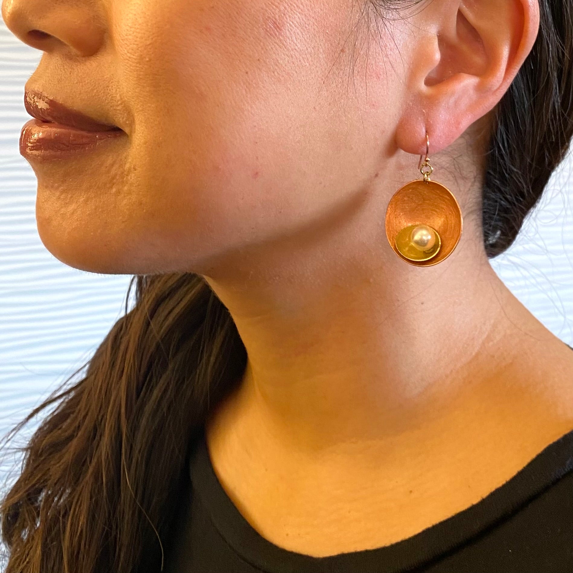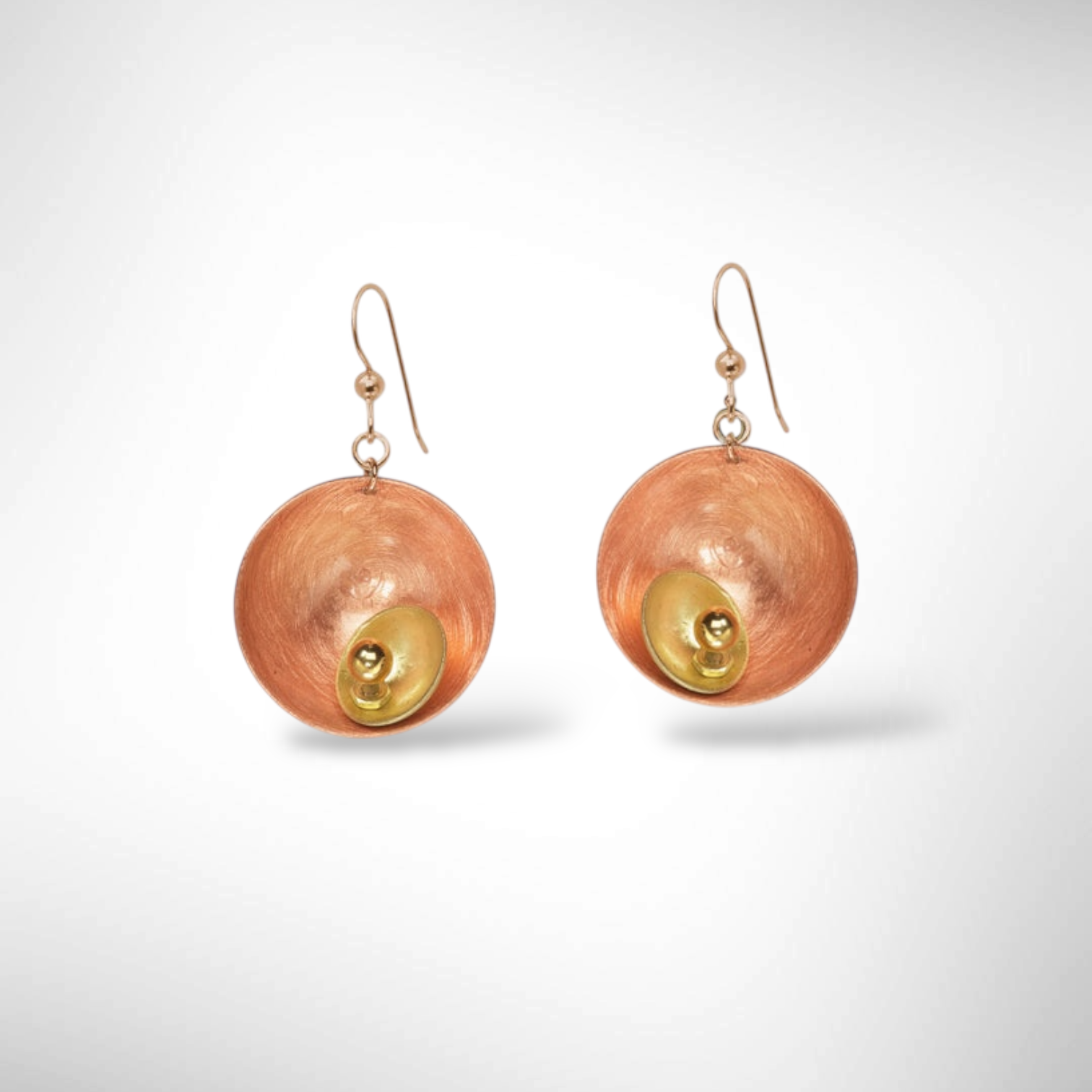 Smaller version of our bigger "Spark" earrings, 1 1/4" overall length Hand-cut, textured aluminum, brass and copper Ear wires are Sterling Silver, Rose Gold fill or 14 karat Yellow Gold fill Brass and copper are sealed with polyurethane to retard oxidation