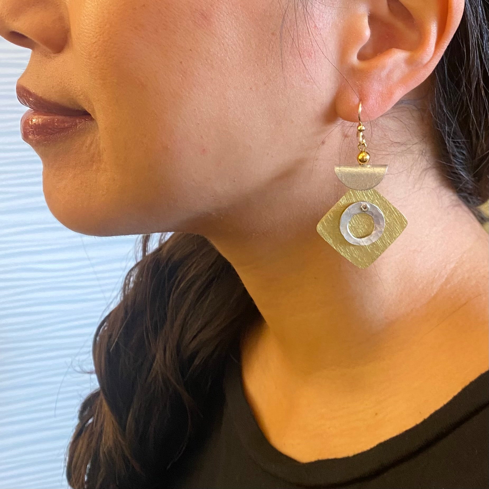 Sophisticated and modern angular dangle earrings "Sway" from the Chick Boss Sculptural Collection Hand-cut and textured aluminum and brass Sterling Silver wires Measures approximately 2-3/4L x 1-1/2W