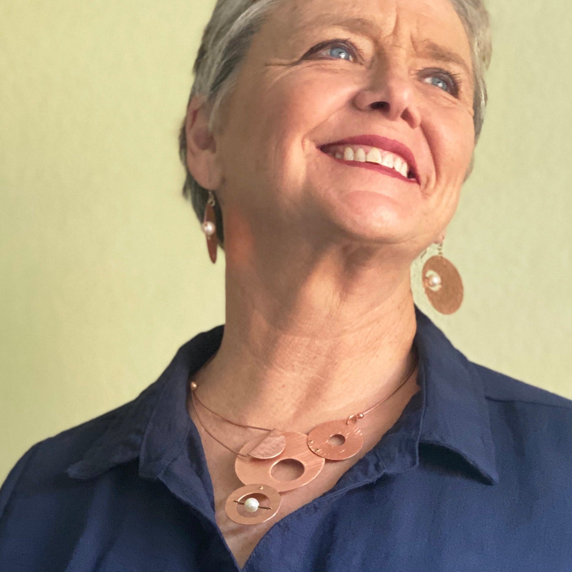 Hand-cut and textured metal pieces form the pendant includes its signature front closure and suspended bead on a “Axis” design. Metal options are aluminum, copper or brass. Accent beads: Simulated Crystal Pearl or Guatemalan jade. Necklace is 20" closed. Copper and brass is sealed with polyurethane to retard oxidation.