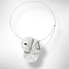 3-Piece sculptural necklace with suspended bead. Medium sized.Delicate wire with front closure, 20" closedHand-cut, textured aluminum, copper and brass.Copper and brass is sealed with polyurethane to retard oxidation.