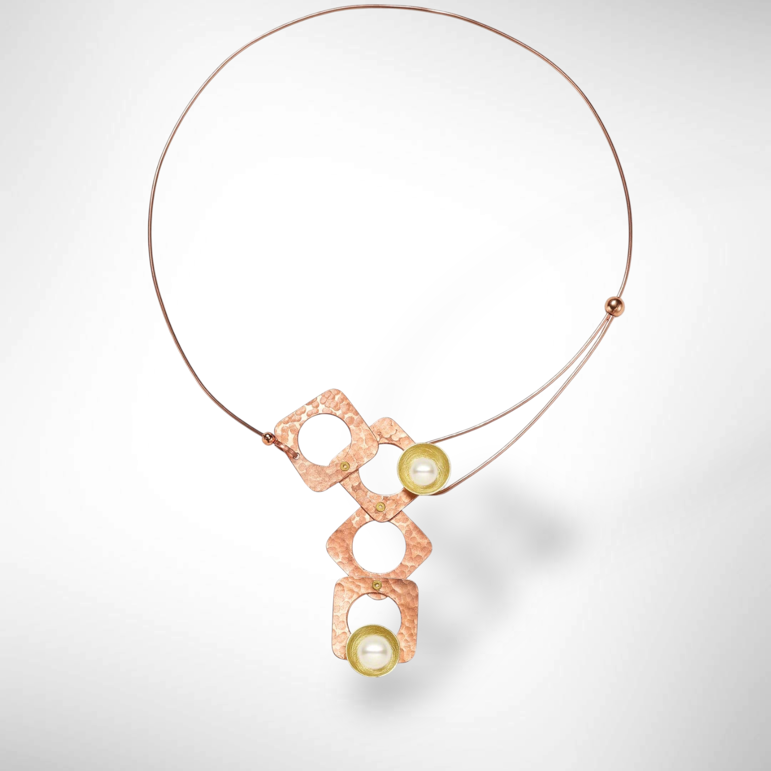 Asymmetrical elegance in a medium sized cubic necklace. Delicate wire and metal necklace with front closure, 18" closed Hand-cut, textured aluminum, brass and copper Brass and copper are sealed with polyurethane to retard oxidation. Accent bead options: metal, Simulated Pearl, Guatemalan Jade