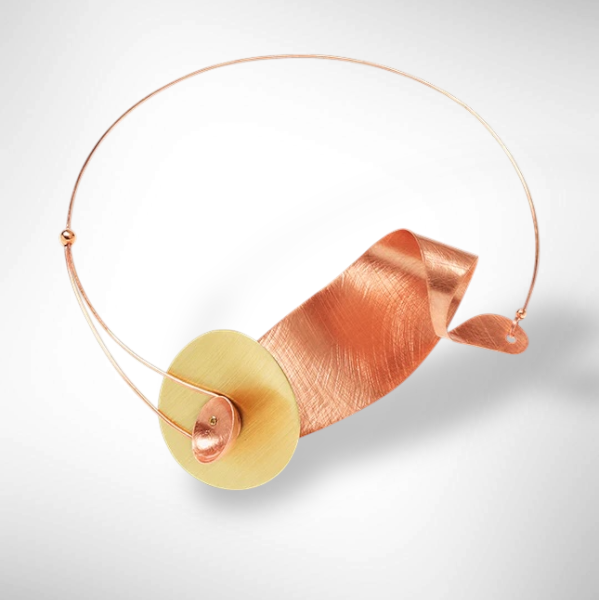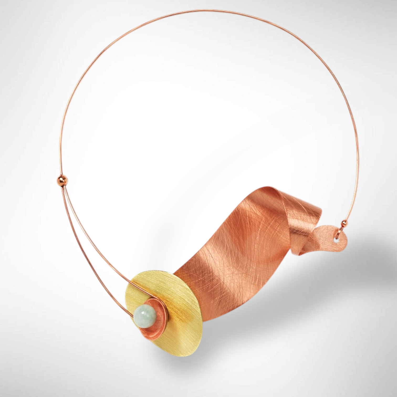 Curvy, sculptural necklace. This necklace runs shorter than our other wire necklaces. Longer wires are available upon requestDelicate wire and metal necklace with front closure, 20" closedHand-cut, textured aluminum, brass and copperBrass and Copper are sealed with polyurethane to retard oxidationAccent bead options: metal, Simulated Pearl, Guatemalan Jade