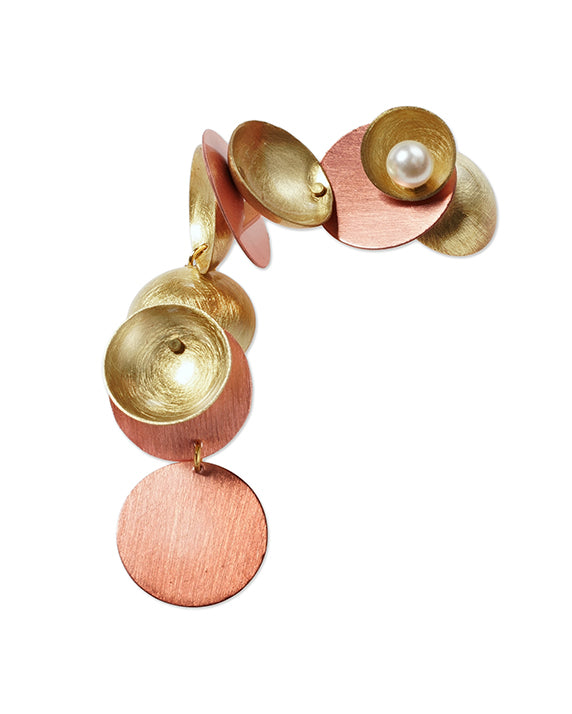 This contemporary pin features cascading hand-shaped half domes and textured metal circles. Finishing bead option is a Simulated Crystal Pearl or Guatemalan Jade. The perfect addition to a shawl, sweater, or cardigan! Hand-cut, textured aluminum, copper and brass. Copper and brass are sealed with polyurethane to retard oxidation. Dimensions: 3 ½" H X 2 1/8" W X 1 1/4" D Pairs wells with: “Cloud” Necklace “Light” Earrings “Cloud” Cuff “Cloud 2” Bracelet “Bark” Ring