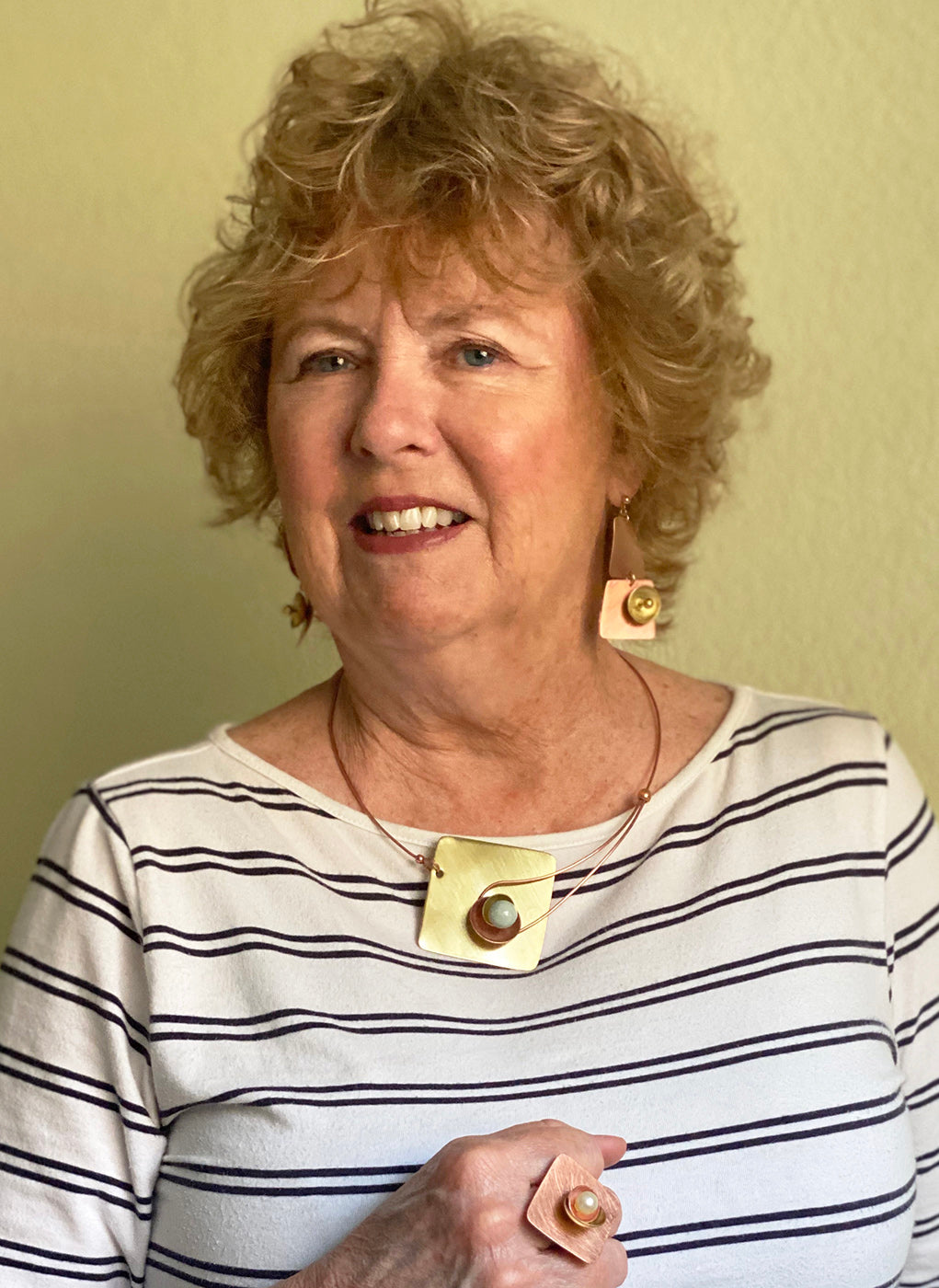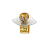 An angular square top with swooping curve. 1 5/8 wide tip to tip. 5/8" tall from the top of the adjustable ring base. 1/2" wide brass ring. Brass and copper are sealed with polyurethane to retard oxidation. Accent bead options: metal, Simulated Pearl, Guatemalan Jade