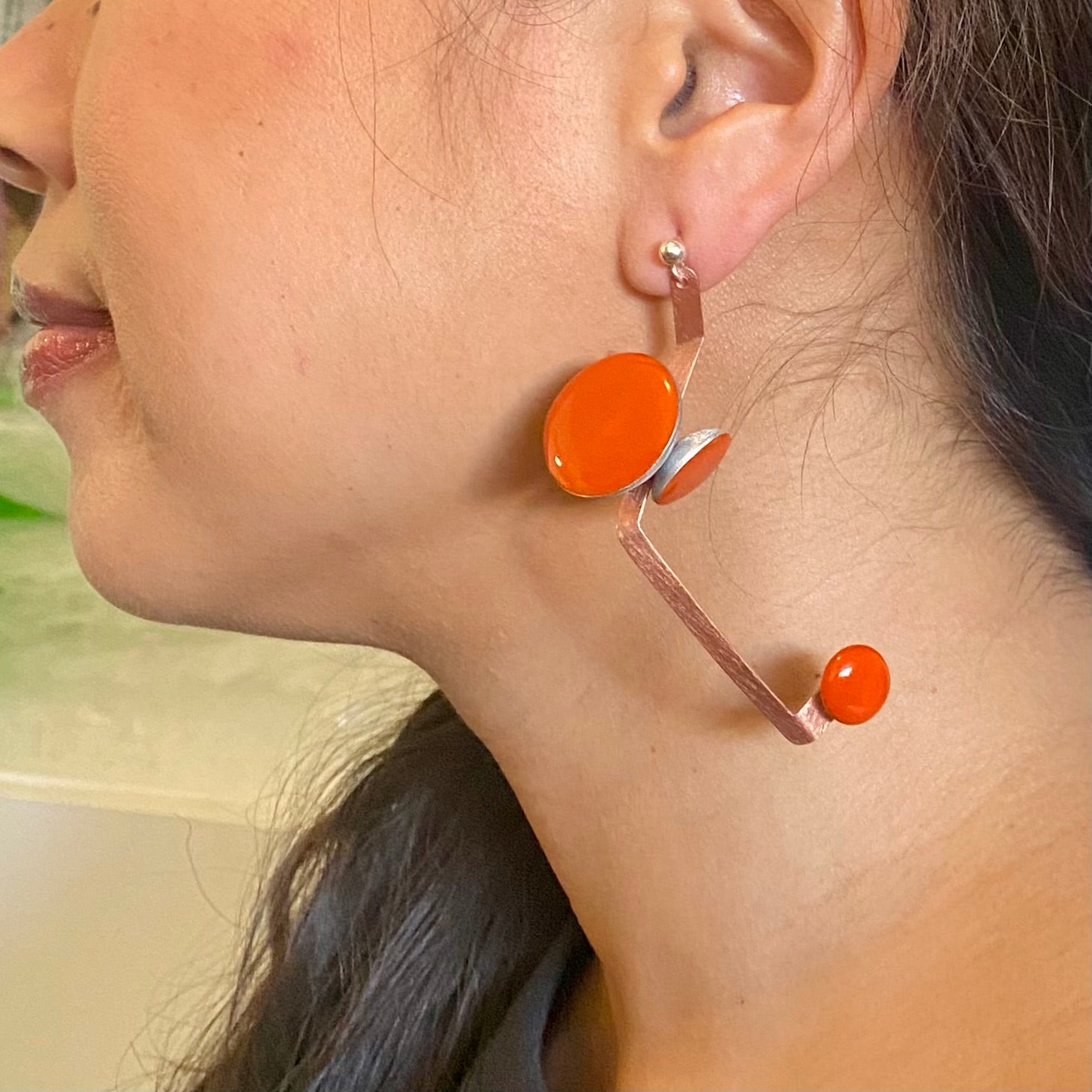 New growth sprouts from the vine in these long and multi-directional earrings A contemporary, almost mid-century look. These long earrings are sculptural and playful. Delicate hand cut & textured aluminum and copper with orange and red resin cups. Copper has been treated with polyurethane to retard oxidation. Sterling Silver posts and large "monster" sized backs.