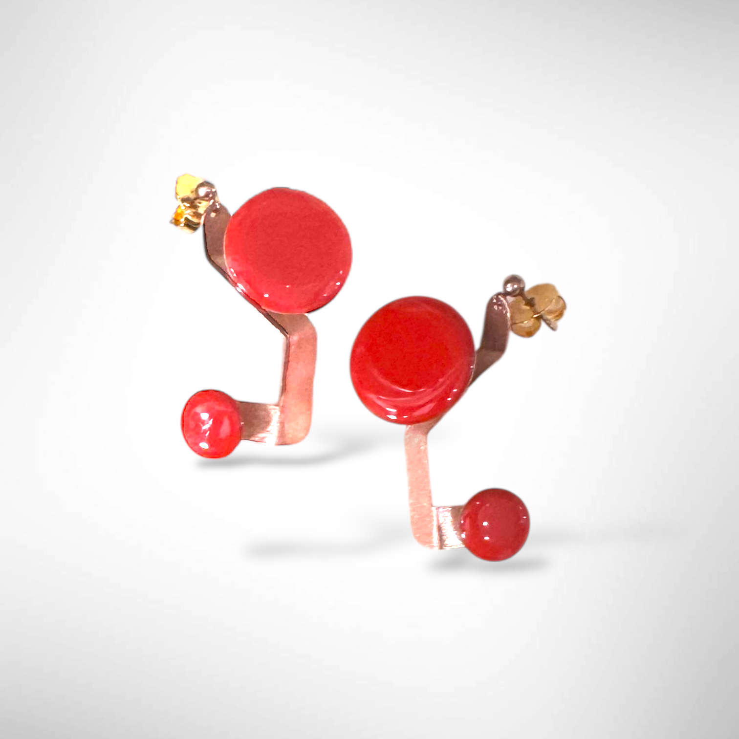 New growth sprouts from the vine in these medium length multi-directional earrings A contemporary, almost mid-century look. These are playful statement earrings. Delicate hand cut & textured aluminum and copper with red resin cups. Copper has been treated with polyurethane to retard oxidation. Sterling Silver posts and large "monster" sized backs.