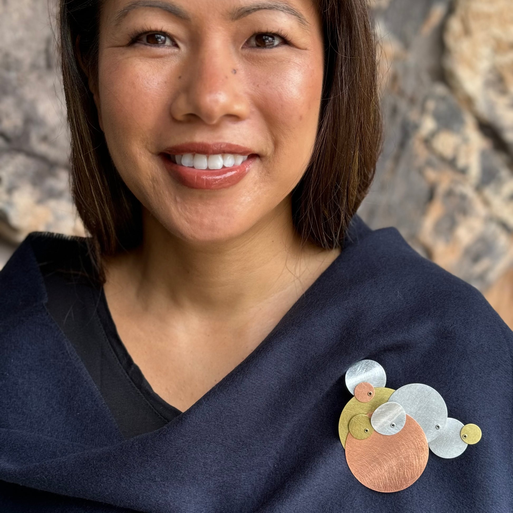 Cluster of multi sized spheres that bring color and movement to any outer garment. Latch pin. Aluminum Brass and Copper Brass and Copper are sealed with polyurethane