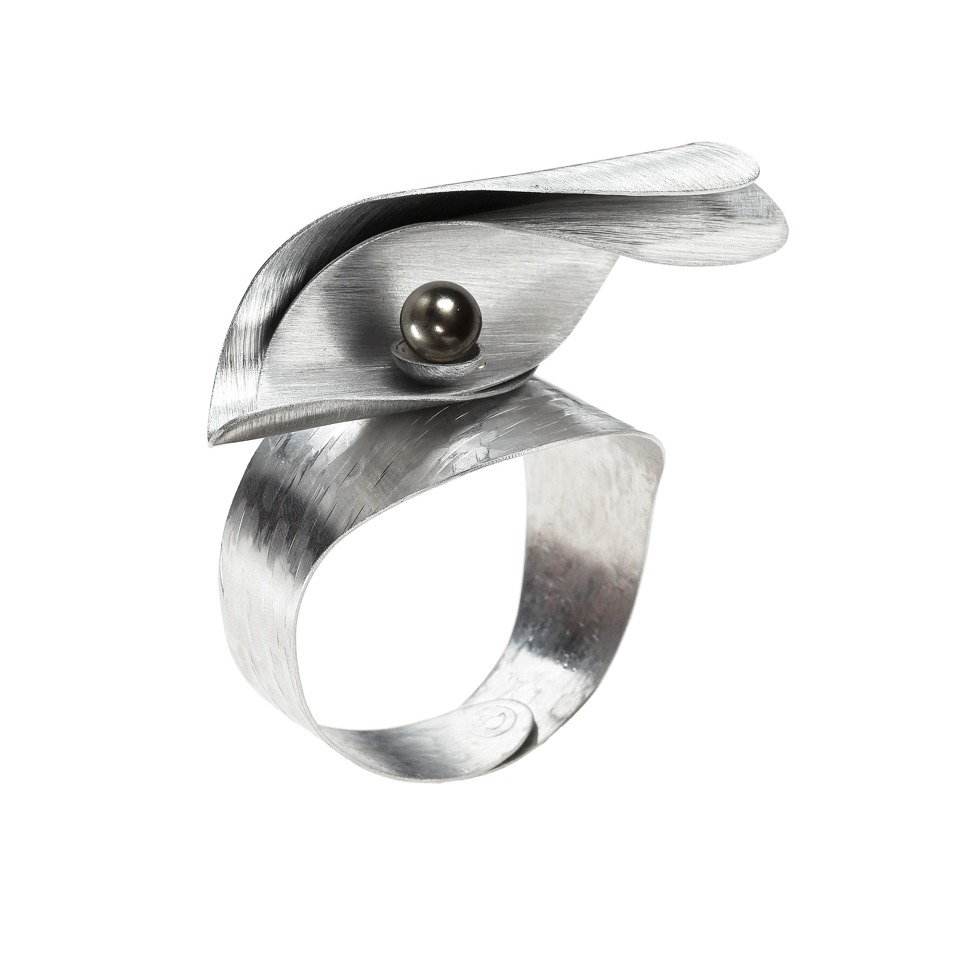 Double wave floats on adjustable cuff. Hand-cut aluminum. Finish bead options of Simulated Crystal Pearl or Guatemalan Jade.